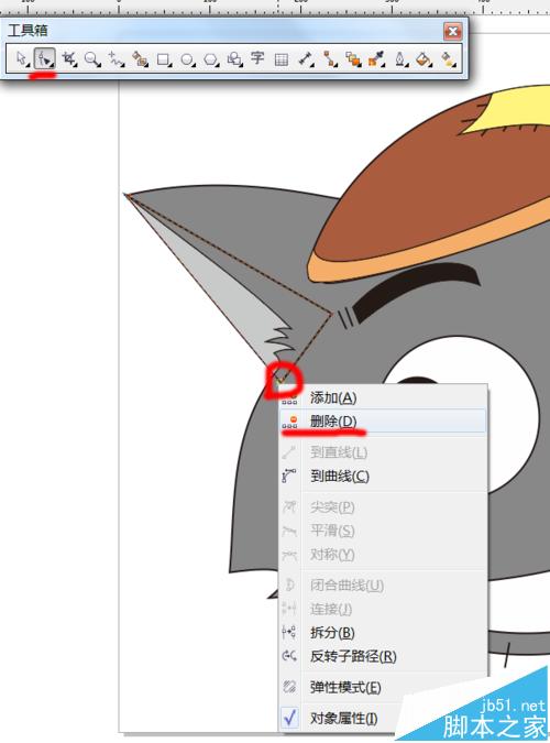 8、填充完成后,若有多余的線條,先點擊“形狀工具”,在右鍵單擊多余線條的節點,刪除,即可完成。