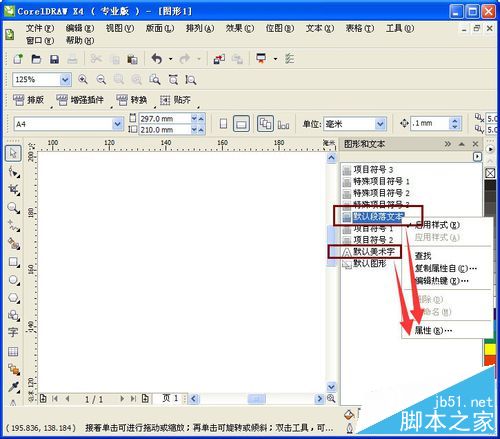2、選擇“段落默認文本”或者“默認美術字”右鍵單擊,彈出設置框,選擇“屬性”如圖,
