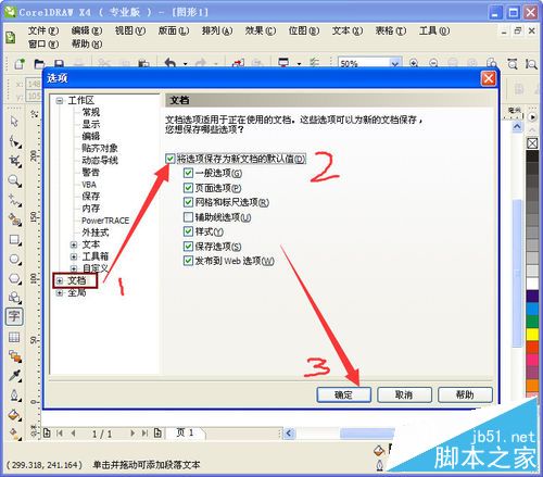 5、設置文檔保存。接上步彈出設置框,如圖,選擇“文檔”——“將選項保存為新文檔的默認值(D)”打鉤,然后確定,即可。