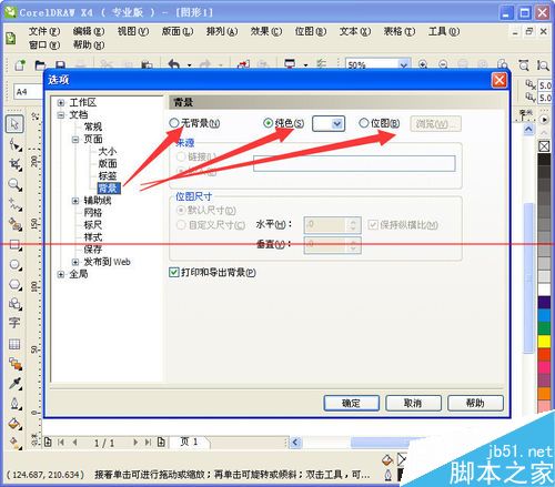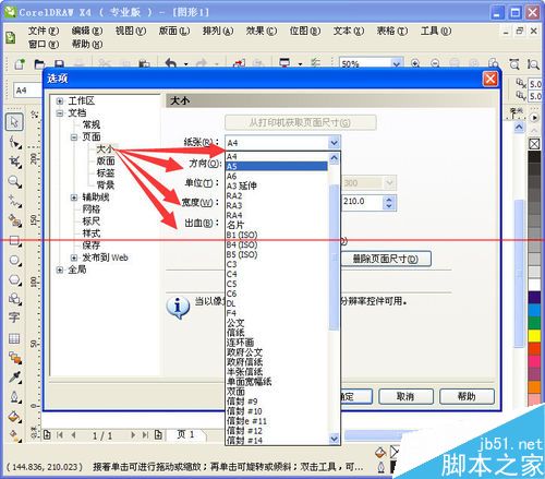 1、顏色設置步驟1,左鍵雙擊工作區域的邊框,然后彈出設置框,如圖,選擇“頁面”——“大小”然后進行設置。紅色箭頭指向的位置,大小、寬度、方向、出血等設置。按需設置就行。