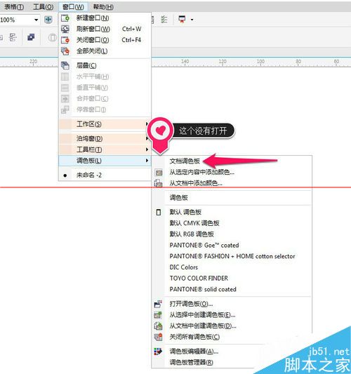 4、打開調色版——找到文檔調色版,發現這個沒有打開。一般打開會顯示打鉤,如果是X7版的會顯示方框。這時沒有顯示,即是關閉的。如圖