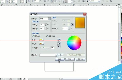 2、繪制球體。選擇橢圓工具,按ctrl鍵繪制正圓,按f11鍵打開漸變填充面板,填充黃色漸變,漸變類型為輻射,輻射中心點如圖所示。取消輪廓色。