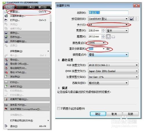1、打開Coredraw軟件,單擊“文件>新建”,在彈出的對話框中選擇"大小"為A4,"原色模式為"CMYK,“渲染分辨率”為300。(一般情況下新建文檔默認值既為上述值,不用選擇。)