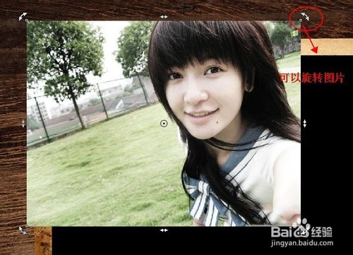 4、適當調正圖片位置。將鼠標移動到圖片邊緣,當鼠標變為”↔“時即可調整圖片大小,單擊選中圖片當鼠標變為圓形”↔“,即可旋轉圖片。