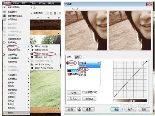5、單擊選中照片后,執行"位圖>模式>雙色”,在”雙色調“類型下選擇”雙色調“。