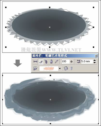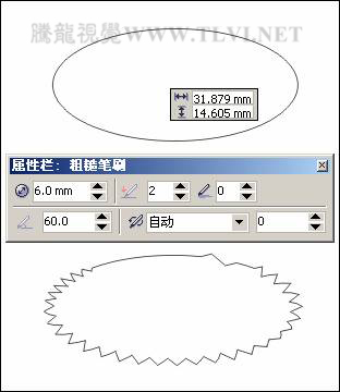 7.3.4 制作步驟:繪制退暈的漣漪(1)選擇工具箱中的"橢圓"工具,在頁面中繪制橢圓圖形,然后按下鍵,將其轉換為曲線對象,然后選擇工具箱中的"粗糙筆刷"工具,參照圖7-86所示設置屬性欄,然后在曲線邊緣進行涂抹,對其進行粗糙處理。
