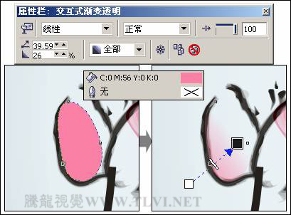 (11)參照圖7-14所示在頁面繪制圖形,然后將其填充為粉紅色,輪廓色設置為無,接著使用"交互式透明"工具,為圖形添加線性透明效果,如圖7-84所示。