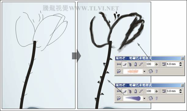 提示:使用"藝術筆"工具,為曲線添加筆觸時。應注意在繪制曲線時的起始點位置,因為曲線的起始點位置決定了為該曲線添加藝術筆觸時的起始位置。