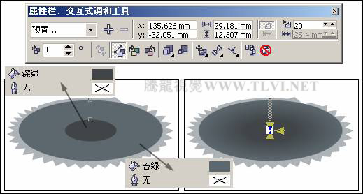 (3)使用"橢圓"工具,分別繪制一個填充為苔綠和一個填充為深綠色、輪廓色都為無的橢圓,然后使用"交互式調和"工具,在這兩個橢圓之間添加調和效果,如圖7-88所示。