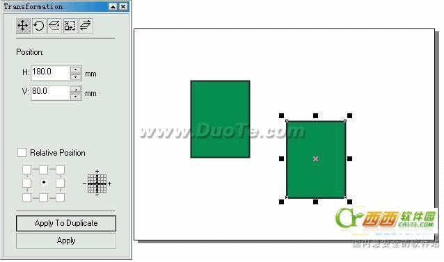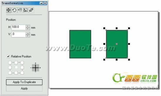 在Transformation (變換)面板中,.如果選中Relative Position(相對位置)復選項,還可以將對象或其副本沿某一方向移動到相對于原位置指定距離的新位置上去 。也就是說,將原對象的定位點作為相對的座標原點,直接輸入在各個方向要移動距離的值即可。