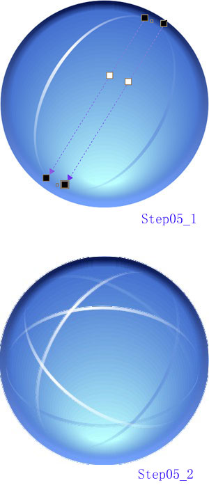 注意:選中藝術筆曲線容易誤操作選中其它對象,一定要仔細處理,確保是對藝術筆進行的操作} 現在可以刪除被打散藝術筆曲線中的多余控制線。 用同樣的方法處理橢圓的另一半。 將左邊的細長月牙形改為為無輪廓、白色填充,右邊的改為無輪廓、R103 G147 B219。 得到結果如圖。 [Step04_3]