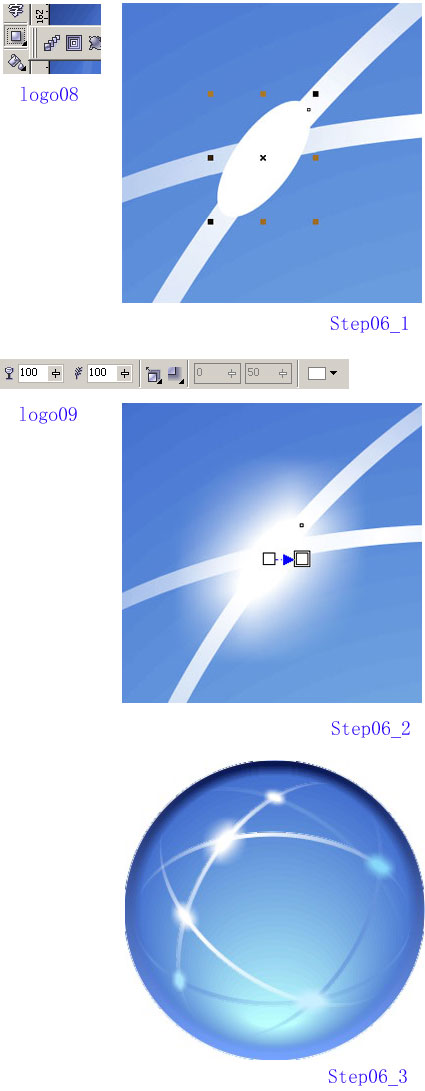 選擇交互式陰影工具[logo08]。在橢圓的中心部位開始,向外稍稍拉動一點距離。在屬性欄上做如下調整:下拉陰影方向——向外;下拉陰影不透明度——100;下拉陰影羽化——100;下拉陰影顏色——白色。[logo09] 我們方便地創建了一個光點的自發光效果。 [Step06_2]