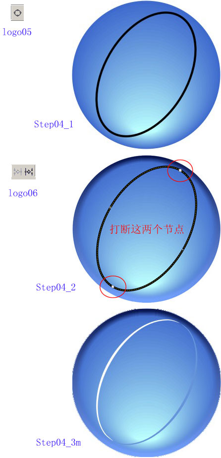 [Step04_1] 選擇節點編輯工具,將圖示的兩個點打斷(Break Curve)[logo06]。按下Ctrl+K,將它打斷(Break Apart)?,F在橢圓成為了獨立的兩半,用選擇工具你很容易驗證這一結果。