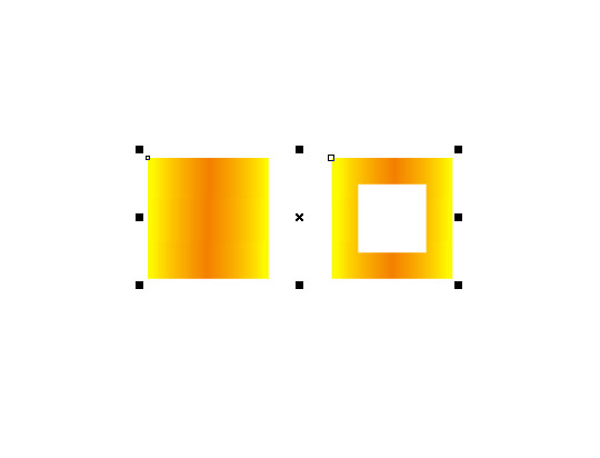 第三步、現在繪制完了圓。我們把里面的正方形進行一個挖空的效果。首先繪制一個小正方形,填充一個黃色-橙色-黃色的漸變,填充完成后在復制一個正方形進行備用,將一個正方形按住shift鍵縮小復制一個小正方形,然后將兩個正方形進行組合。做出里面挖空的方形效果。如圖所示: