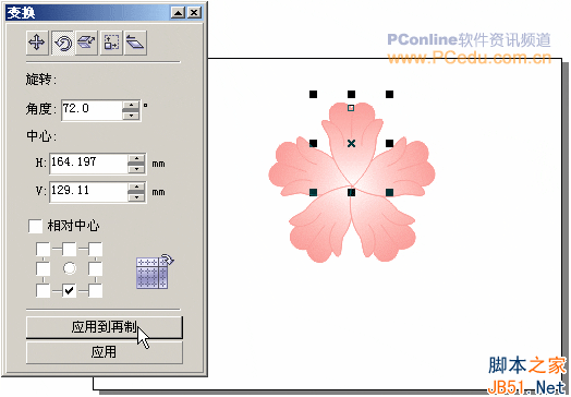 (挑選工具)選定花瓣,調出變換泊塢窗,調節花瓣的大小、旋轉花瓣(旋轉的角度根據花瓣的瓣數來定,我們做的是五瓣花,所以其旋轉角度為72度)。如果做出來的花形狀不太理想,你還可以就花瓣的形狀和花瓣的位置進行調整