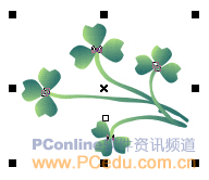 此時包裝盒的右下位置上還比較空白,我們可以考慮在這里畫些水草類的植被進行填充。而藝術筆刷中的植物圖案又再次成為我們創作的好素材。因此我們點選“藝術筆工具” 后,依舊選擇“噴罐”模式。然后在該模式屬性框的“噴涂列表文件列表”里選擇“shamrocks”項,大意是三葉草。接著在工作區里畫上一個較簡短的路徑就夠了,不必太多。效果如圖10。