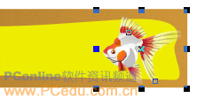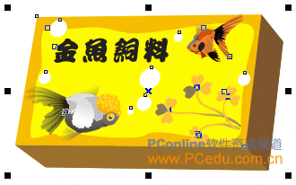 采用我們前面已使用過的方法,將一條金魚從藝術筆刷路徑中獨立分離出來,經適當的縮放后把它放置在包裝盒底部的右邊,如圖16。