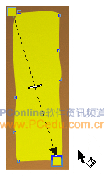下面,我們來繪制這個包裝盒的側面。同樣是先用“矩形工具” 在工作區中隨意畫一個矩形,然后通過屬性框,將該矩形的寬高分別設置為15和39毫米。再用“交互式漸變工具” 從該矩形的左上角開始至右下角拉出一條線性漸變的顏色控制手柄。然后在“調色板” 泊塢窗里設置該漸變手柄的起點色的RGB數值為:R=126、G=86、B=45,終點色的RGB數值則為:R=189、G=131、B=71。最后別忘了用鼠標右鍵單擊顏色欄最上方的無色按鈕 ,以取消該對象的輪廓線顏色。效果如圖18。