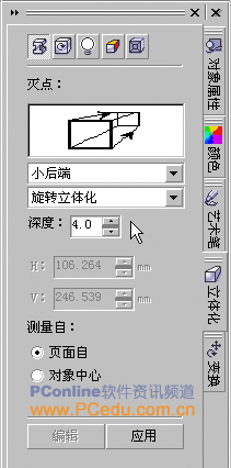 現在,組成這個包裝盒的正面、底部及側面的圖案都繪制完成了,下面將要做的就是借用軟件自帶的立體化功能將這三個組合對象進行有機地拼裝起來。我們先點選擊這個包裝盒的正面圖案,然后點擊菜單欄上的“窗口——泊塢窗——立體化”命令,從而啟動“立體化”泊塢窗。我們在該窗口的“立體化相機”選項當中先點擊位于左下角的“編輯”按鈕,然后在“立體化類型”選項中選擇“小后端”,深度則設置為4,完成后要記得點擊“應用”按鈕,如圖21。