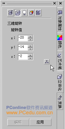 接著再切換到“立體化旋轉”選項當中,為這個包裝盒設置三維旋轉效果。先點擊“編輯”按鈕后,選擇數值三維旋轉模式,旋轉值設置為“X=-20 Y=-14 Z=-2”,完成后點擊“應用”按鈕。如圖22。