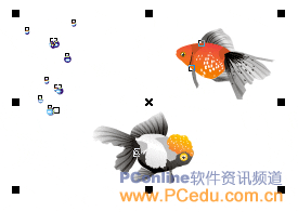 由于是矢量繪圖,因此我們也不必在意這些金魚圖象的大小。在這些金魚當中選出你認為最漂亮的兩條出來,然后將其它的藝術筆金魚路徑刪掉。但在多數情況下,我們所選擇的金魚都會與其它不想要的金魚屬于同一藝術筆路徑,如圖06中的兩條金魚就屬于同一條藝術筆路徑。