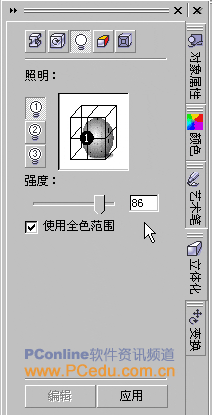 圖22我們再切換到“立體化光源”選項,進行光源點的設置。點擊“編輯”按鈕后,在照明設置區里為立體化對象添加一個光源,并設置該光源的強度為86。如圖23。
