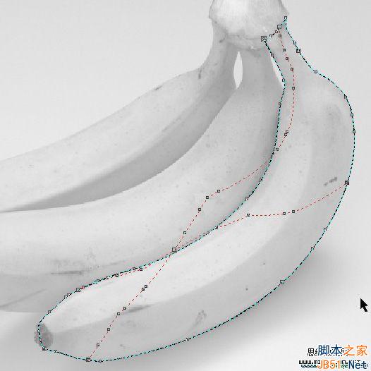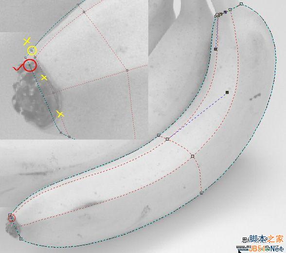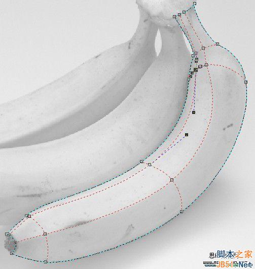 7、放大顯示,在底端邊線合適的位置雙擊生成第二主線,也把它調整到與香蕉的第二突起棱線重合。請