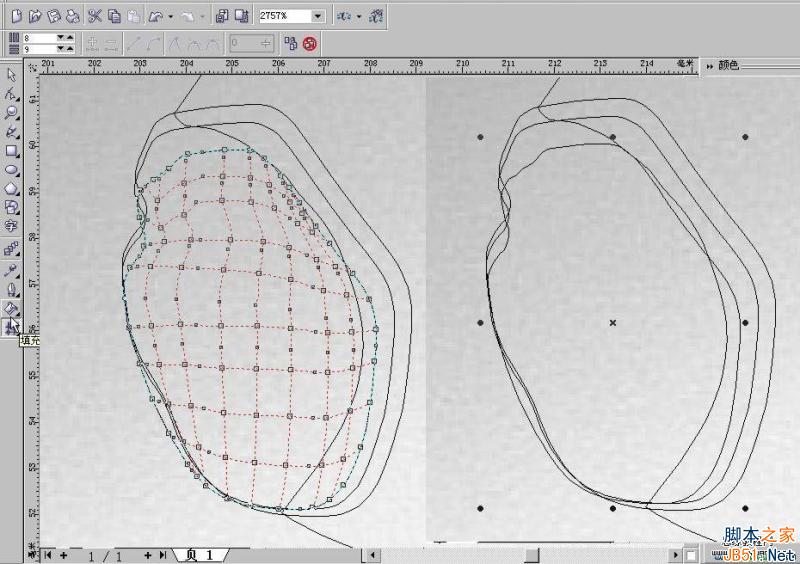 刪除多余節點的另一個目的是要找到網格的“關鍵節點”(“關鍵節點”只是我的叫法,不知Corel公司是否承認),我發現任何閉合圖形對象只要用于網格填充,都會有4個“關鍵點”,它們控制著網格的走向和分布。 為了說明問題,我做了一個對照圖。