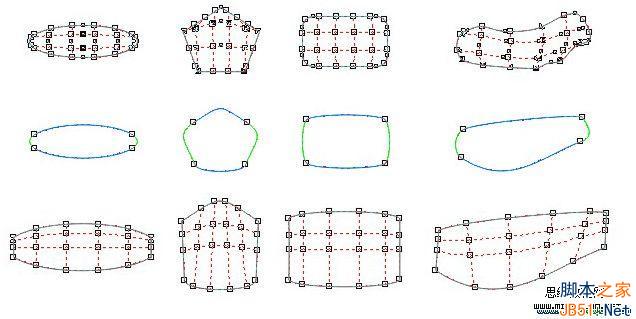 從上圖可以看出,在沒有刪除多余節點之前,網格圖形的輪廓線上按給定的縱橫數值分布著很多節點,規則的幾何圖形好一點,任意圖形的4 個“關鍵點”很難被發現,當我刪除多余節點后,4 個“關鍵點”就顯出來了。我把4個“關鍵點”對應的4條邊分成了藍色組和綠色組,它們上下左右對應,在綠色邊上增加節點會生成水平網格線,藍色邊上增加節點就生成垂直網格線。而水平與垂直網格線會根據藍色或綠色邊線的彎曲幅度成比例地變形。以綠色邊為例,大家從最下一排圖可以看出,我把綠色邊的控制點收回與“關鍵點”重合后,設置的垂直網格線也基本成直線了,只是隨綠色邊的傾斜和藍色邊的彎曲而略有些傾斜和彎曲而已,而這樣有規律的變形我們就比較容易控制了。
