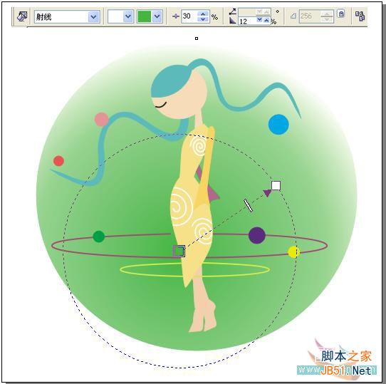 然后繪制一個大圓,按“Ctrl+End”組合鍵(或者右鍵單擊鼠標,執(zhí)行“順序”/“到后部”),將其置于所有對象后面,然后選擇“交互式填充工具”,在其屬性欄中設置“填充類型”為“射線”,起點顏色為淡黃色(Y:20),終點顏色為綠色(C:51,M:1,Y:99),然后調整漸變位置和方向,效果如圖16B所示: