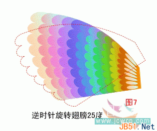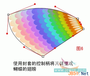 接下來,繼續該圖封套效果的制作,使用鼠標分別調整該圖四角的控制柄,直至調和圖與翼形輪廓圖各邊吻合,效果見(圖6)。怎么樣,有點蝴蝶翅膀的意思了吧!(封套效果是CORELDRAW這款軟件,在制作異體圖形過程中最為強大的后期調整武器)。調整完成后,清除翅膀輪廓線。