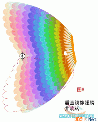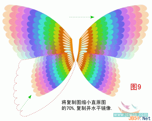 接下來,將復制圖縮小為原尺寸的70%,并如圖所示位置安置。圈選上下兩翼,復制,并為復制圖做水平鏡像處理。好了,現在我們的蝴蝶羽翼豐滿就差身軀了。效果見(圖8)和(圖9)