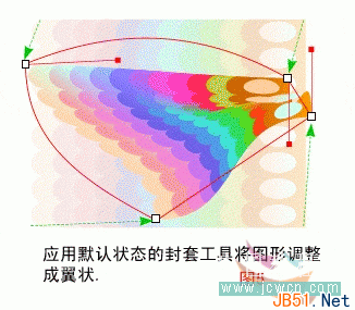 這工作比較復雜,讓我們干吧!首先,選取調和并群組后的對象,逆時針旋轉90度并按圖中所示的樣式將其置于上一步畫好的翼狀圖形中心。在主工具欄中選取造型工具的“封套”功能,在默認狀態下,使用鼠標分別拖動封套的四個頂角,即(圖5)中綠色箭頭所指的地方,使圖形各邊扭曲變形,并移動到示意圖所示的位置。該過程試圖將我們做好的調和圖與后畫的翼狀圖重合,從而制作出一個蝴蝶翅膀的雛形,效果見(圖5)。
