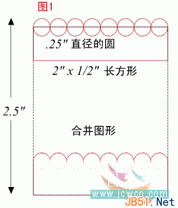 選取圓形和小長方形,在“排列”下拉菜單中選擇“合并對象”功能,該過程將清除圓形的下邊及長方形的上邊,構成一個完整的圖形,復制該圖并將其置于原圖之下2.5”處。效果見(圖1)。