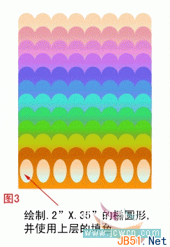 使用橢圓工具繪制一個.20”X.35”的橢圓,并將上層圖形的顏色復制到新繪制的橢圓中。將該圖復制7遍,并如圖中所示排列,如果不齊可使用“對齊”工具中的均勻分布功能加以調整。群組所有圖形。效果見圖(3)(小技巧提示:各位在復制圖形屬性時,比如顏色等,我們可以通過右鍵點擊圖形并拖放到目標圖形的方式解決)。