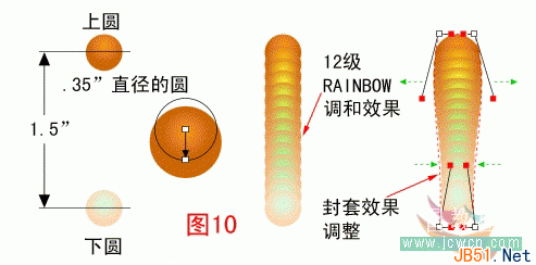 繪制一上一下兩個直徑均為.35”的圓形,并分別填入圖2中使用過的顏色。其中上面的圓使用C,D兩色的圓形漸變色,填色中心點如圖中所示。為下面的圓形填入A,B兩色的圓形漸變色,中心的調整如上圖。選擇兩個圓形并為之應用12級的RAINBOW調和效果,接下來,使用“造型工具”中默認方式的“封套” 效果進一步調整蝴蝶的身軀直至圖中的效果。效果見(圖10)。