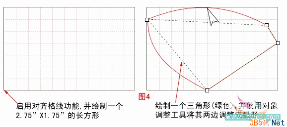 啟動“對齊格線”功能,繪制一個2.75”X1.75”的長方形,圖中的粉色虛線格子代表輔助格線的寬度為1/4”。使用自由筆工具繪制一個三角形,圖中標為綠色虛線。取消對齊格線,使用對象編輯工具,按圖中所示的方式調整該三角形,圖中標為紅色。調整后的結果是該圖形上邊和左邊分別成弧形,正個圖形象一個蝴蝶翅膀,效果見圖(4)。