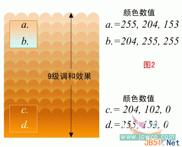 使用填充工具的線性填色方式為上部的合并圖形著色,選用顏色數值為a和b。接下來,使用圖中的c,d兩色為下面的圖形應用線性漸變色。選取工具條中的“調和”工具,然后點選下面的波浪狀圖形,并向上圖拖動鼠標,使之產生漸變的調和效果。在屬性欄中將調和層級設為9,效果見(圖2)。