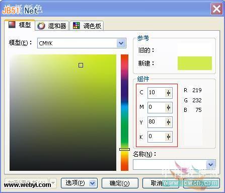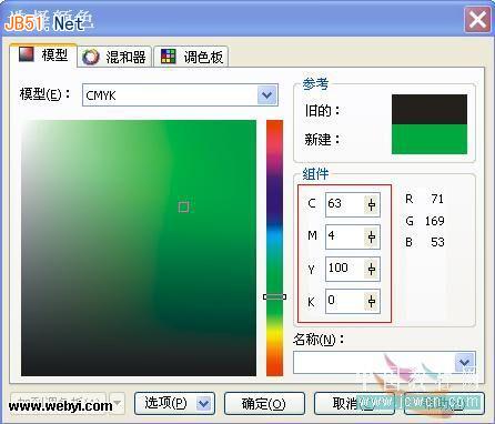 5、用同樣的方法為“顏色調和”選項區“到”后的色塊設置顏色為淡綠色(C:10,Y:80),最后將“中心位移”選項區的“垂直”參數設置為17%,如圖5A所示: