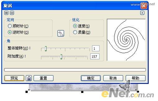 5.執行“位圖”---“扭曲”---“漩渦”命令,在打開的對話框中選中“逆時針”命令,其他參數如圖6所示進行設置,得到的圖像效果圖7所示: