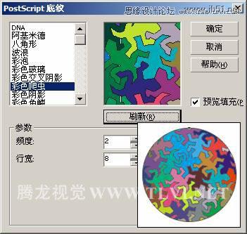 (2)保持圓形的選擇狀態,在“交互式PostScript填充”的屬性欄中單擊“編輯填充”按鈕,打開“PostScrip底紋”對話框。然后參照圖4-109所示,勾選“預覽填充”前的復選框,并在“參數”選項組中設置相關的選項參數,單擊“確定”按鈕應用PostScript填充。