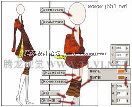 (7)接下來再為女孩兒下身衣服圖形上的褶皺圖形填充與下身圖形相同的紋理效果,然后使用“交互式透明”工具,為圖形添加透明效果,如圖4-95所示。