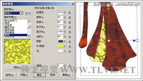 提示:單擊工具箱中的“填充”工具,在彈出的工具條中單擊“紋理填充對話框”按鈕,同樣可以打開“底紋填充”對話框。CorelDRAW為讀者提供了多個底紋庫,在“底紋庫”下拉列表中可選擇不同的底紋庫名稱。在“底紋列表”中選擇需要的底紋樣式,對話框右側的區域會顯示有關選擇樣式的設置選項,單擊“預覽”按鈕,將顯示系統隨機變化的填充效果。