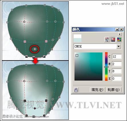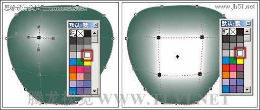(7)接下來參照圖4-116所示選中網格線上的一個節點,然后在窗口右側的調色板中的“白”色塊上單擊,為選中的節點填充白色,制作出圖形的高光。