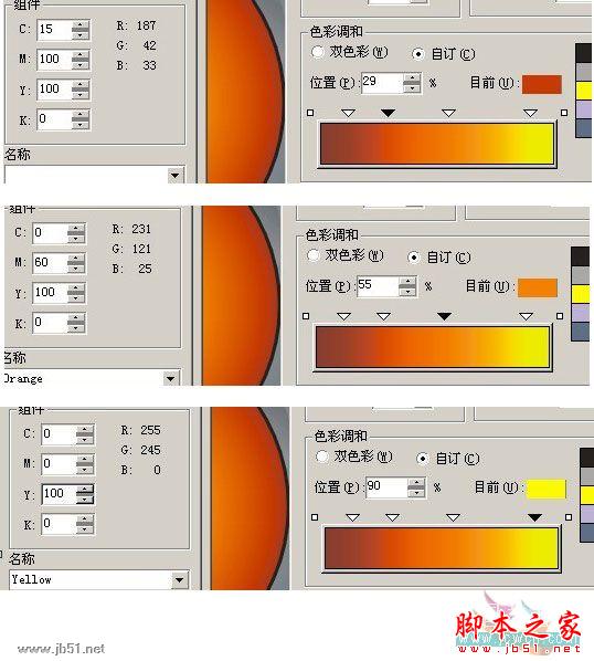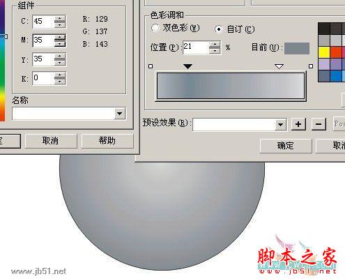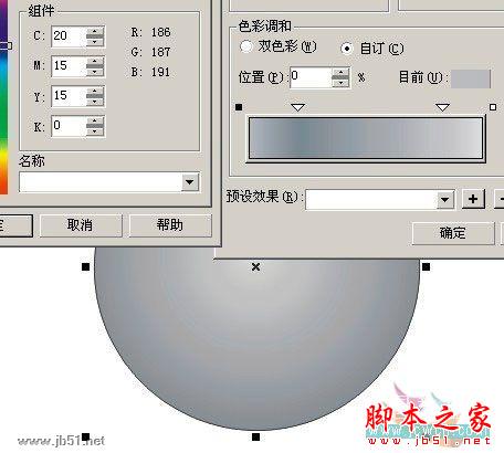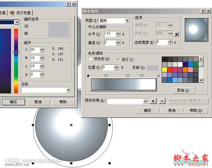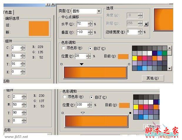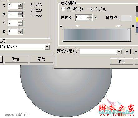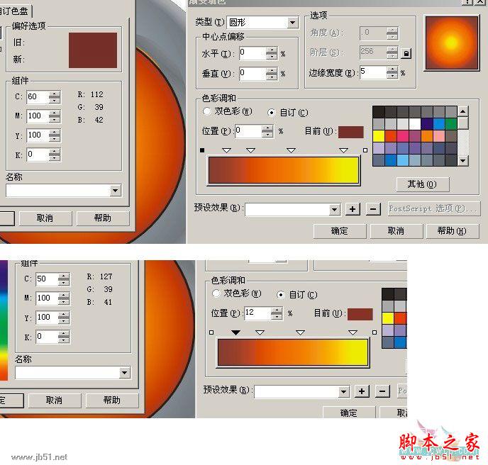 將兩個圓復制出來,開始調色,先調小圓的顏色,按F11調節,自己看,顏色的比對,還有位置,漸變的類型,中心點的位置
