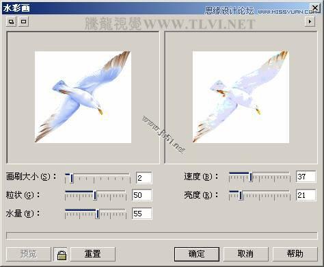 (3)執行“文件”→“導入”命令,導入本書附帶光盤/Chapter-09/“鳥.psd”文件,接著執行“位圖”→“藝術筆觸”→“水彩畫”命令,參照圖9-38所示設置對話框,為圖像添加水彩畫效果。