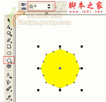 第1步:打開CoreDRAW軟件,新建一個新文件,點擊“工具箱”→“多邊形”工具在繪圖頁面中繪制作一個八邊形,接著將圖形填充顏色設置為[黃],輪廓顏色設置為無色,如下圖: