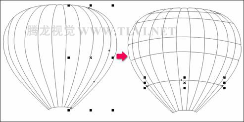 (2)接下來使用工具箱中的 “3點曲線”工具,在熱氣球上面繪制曲線,如圖12-39所示,然后將熱氣球上的曲線群組。讀者也可以執行“文件”→“導入”命令,將本書附帶光盤/Chapter-12/“氣球網格.cdr”文件導入使用,調整其位置即可。