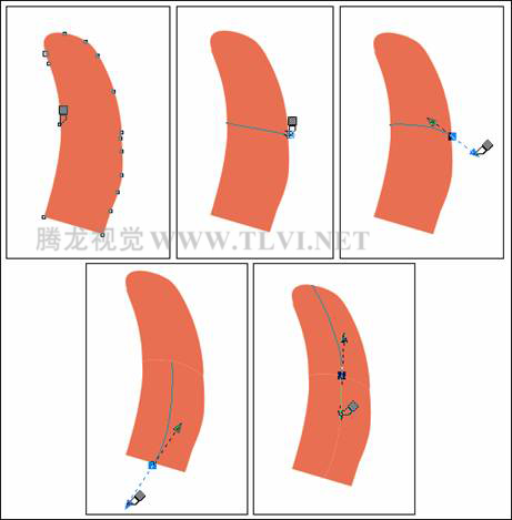 提示:按下<Shift>鍵,將鼠標移到需要切割圖形的邊緣,當刻刀工具變為豎立時,單擊鼠標,然后移到圖形另一邊緣,鼠標再次變為豎立時單擊鼠標,不要松開鼠標,向一旁拖動出它的控制柄,調整切割線的彎曲度,然后再松開鼠標,將圖形切割。