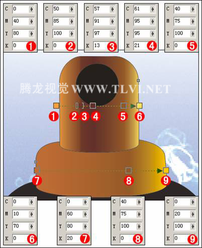 “交互式填充”工具,為香水瓶下半身圖形填充漸變色。然后將香水瓶上半身圖形填充為深褐色,如圖12-95所示。
